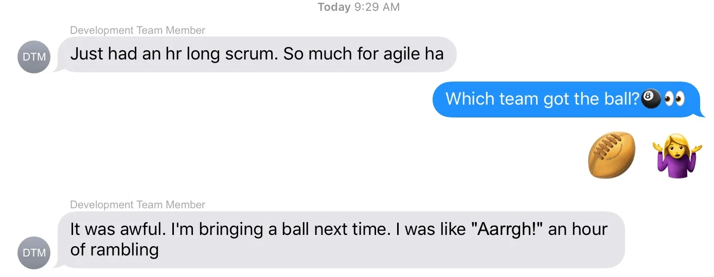 In the text exchange above, DTM has an idea as to how to improve the meeting. The “ball” she suggests bringing next time will serve as a talking stick to support her team’s agreed upon “one speaker” team norm at the Daily Scrum. Another idea DTM’s team might consider is a visible timer to serve as a reminder that the Daily Scrum is only part of the day’s “work”. (Scrum reinforces this idea through its rule limiting the Daily Scrum to a 15 minute time-box).