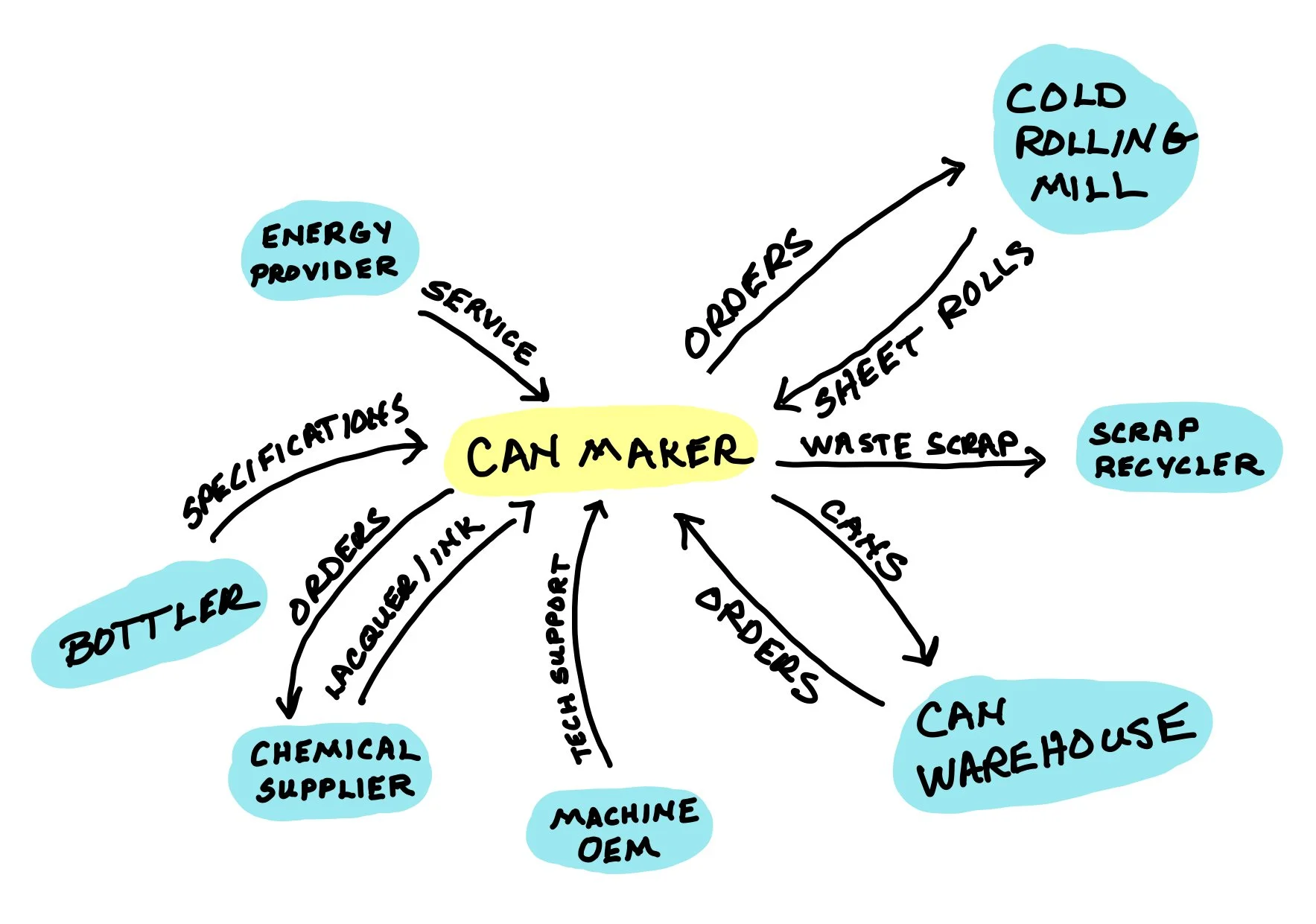 A boundaries and interactions map for a can maker can be depicted as a hub and spoke diagram with the can maker at the center hub and those with whom the can maker interacts at the ends of the spokes. What is exchanged is written along the spokes.
